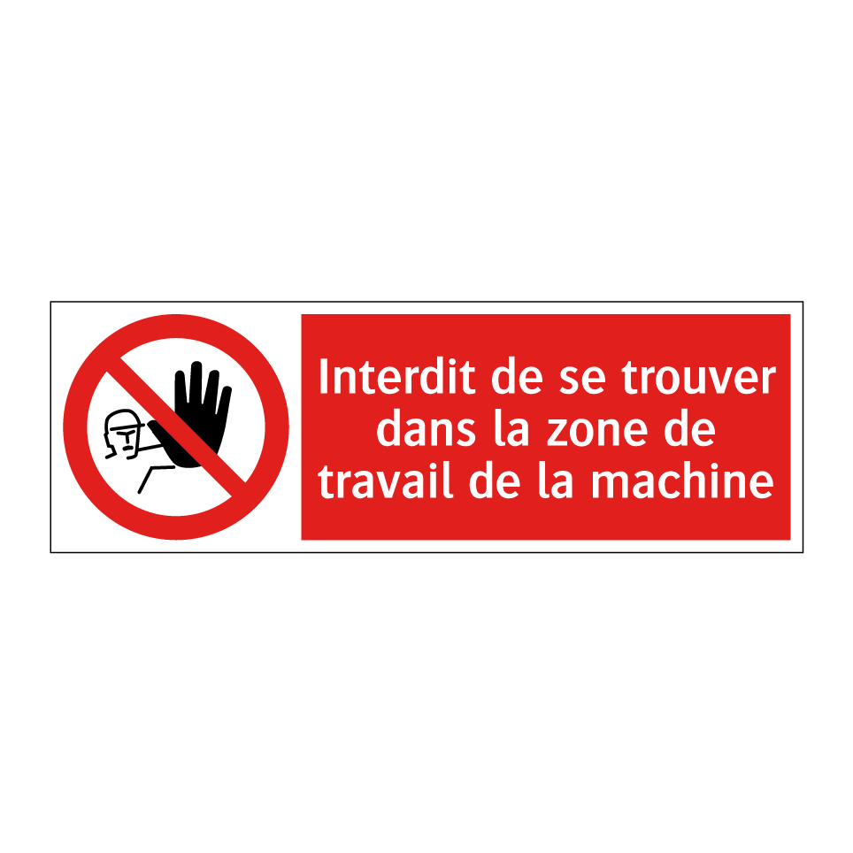 Panneau d'interdiction avec le texte : "Interdit de se trouver dans la zone de travail de la machine" et une symbolique claire.