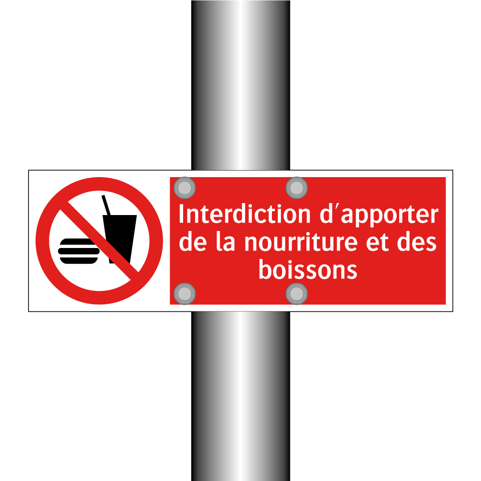 Panneau d'interdiction avec le texte : "Interdiction d'apporter de la nourriture et des boissons" et une symbolique claire.