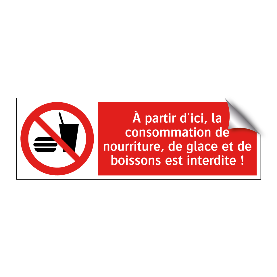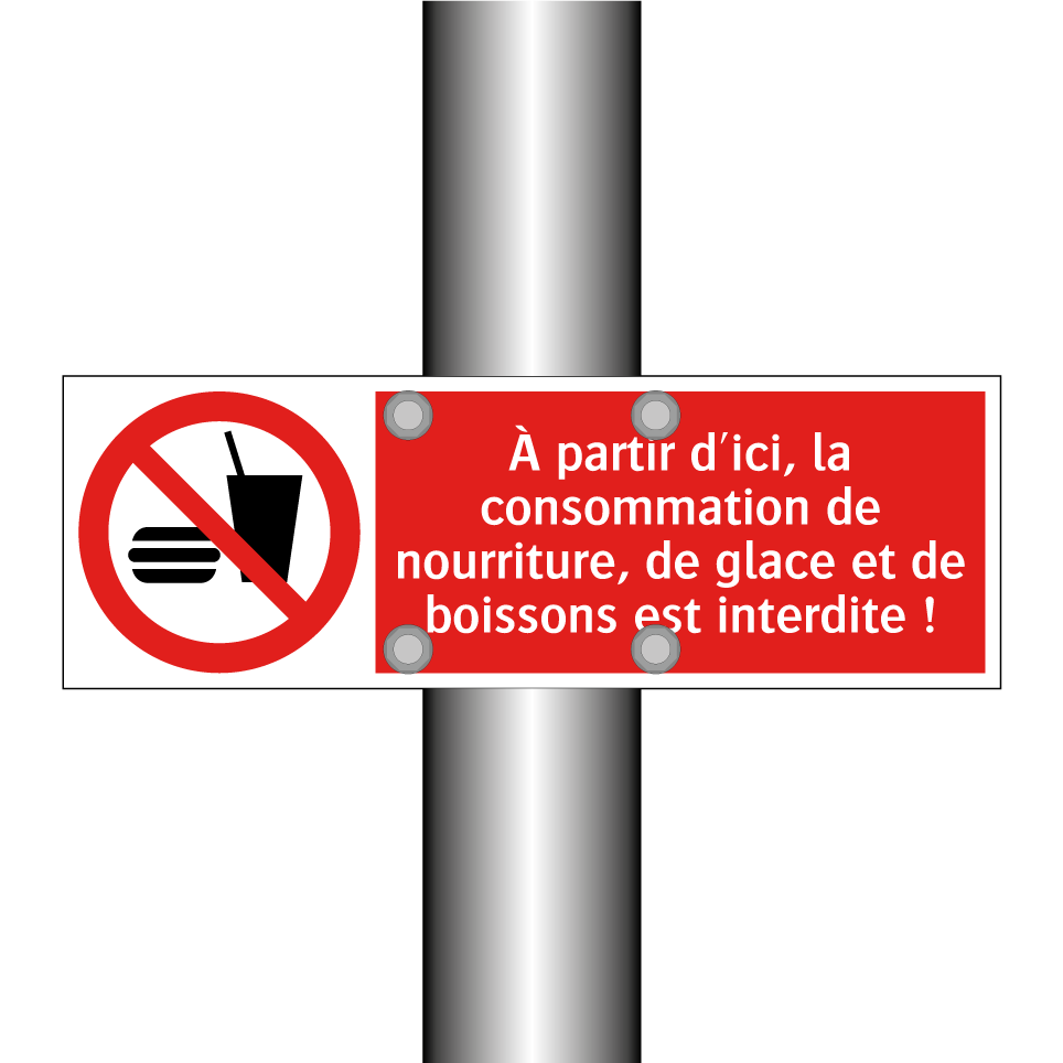 Panneau d'interdiction avec le texte : "À partir d'ici, la consommation de nourriture, de glace et de boissons est interdite !" et une symbolique claire.