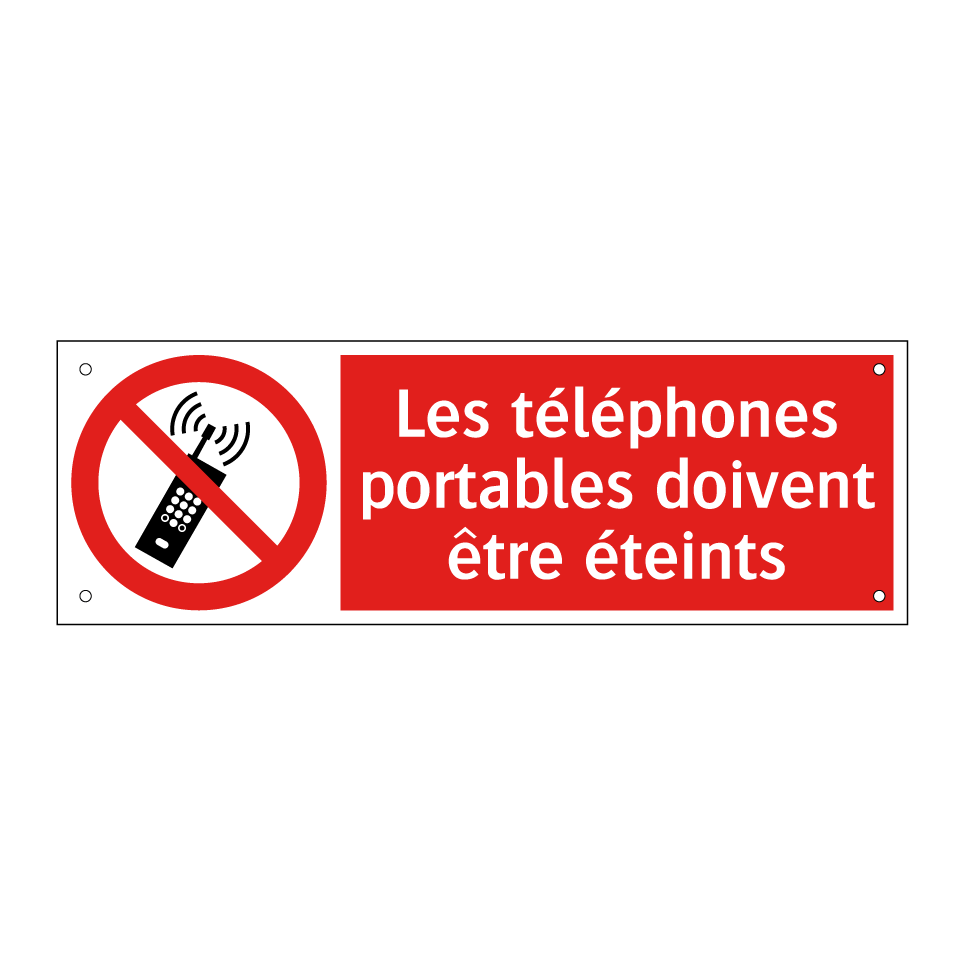 Panneau d'interdiction avec le texte : "Les téléphones portables doivent être éteints" et une symbolique claire.