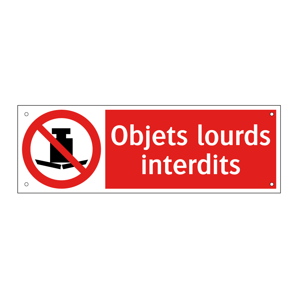 Panneau d'interdiction avec le texte : "Objets lourds interdits" et une symbolique claire.
