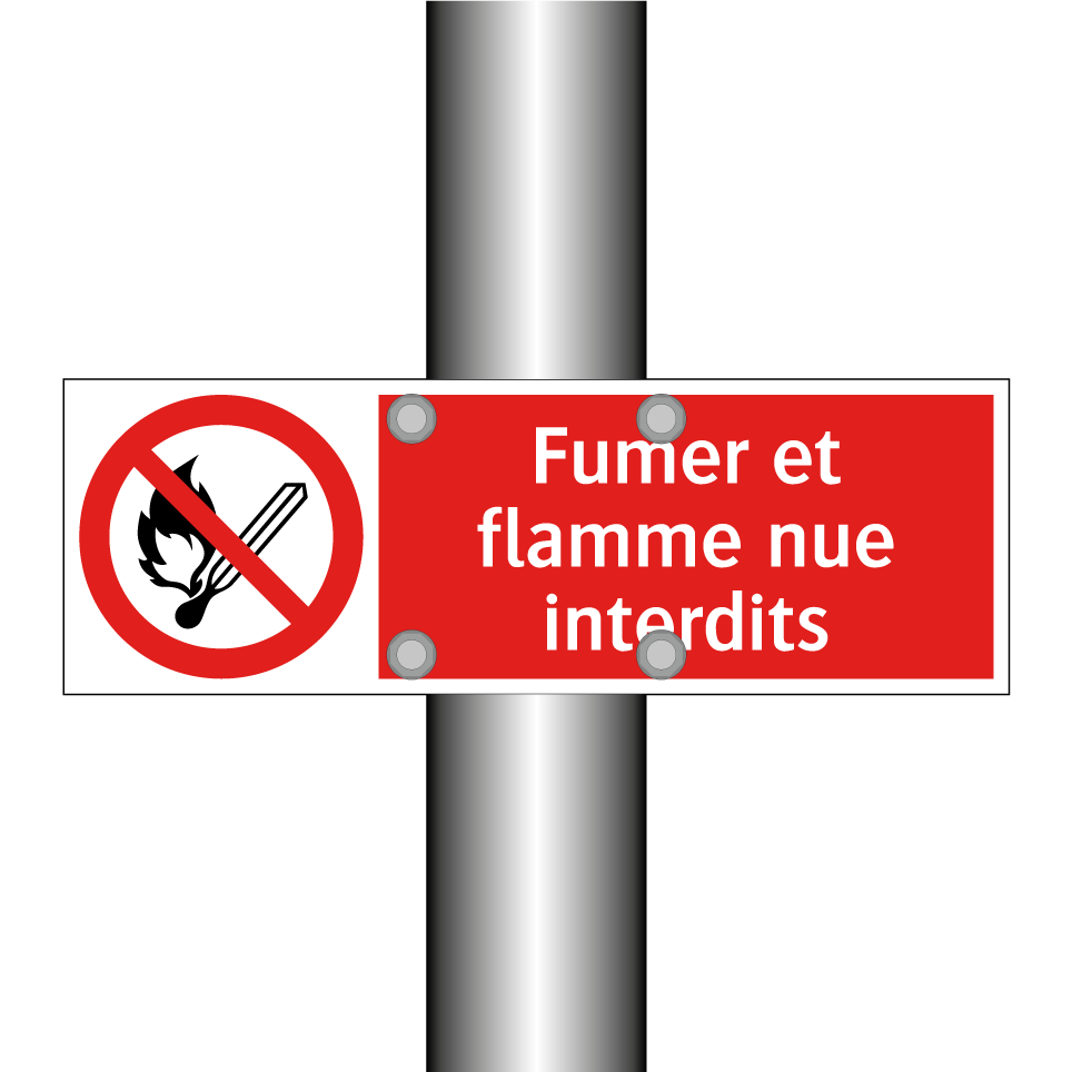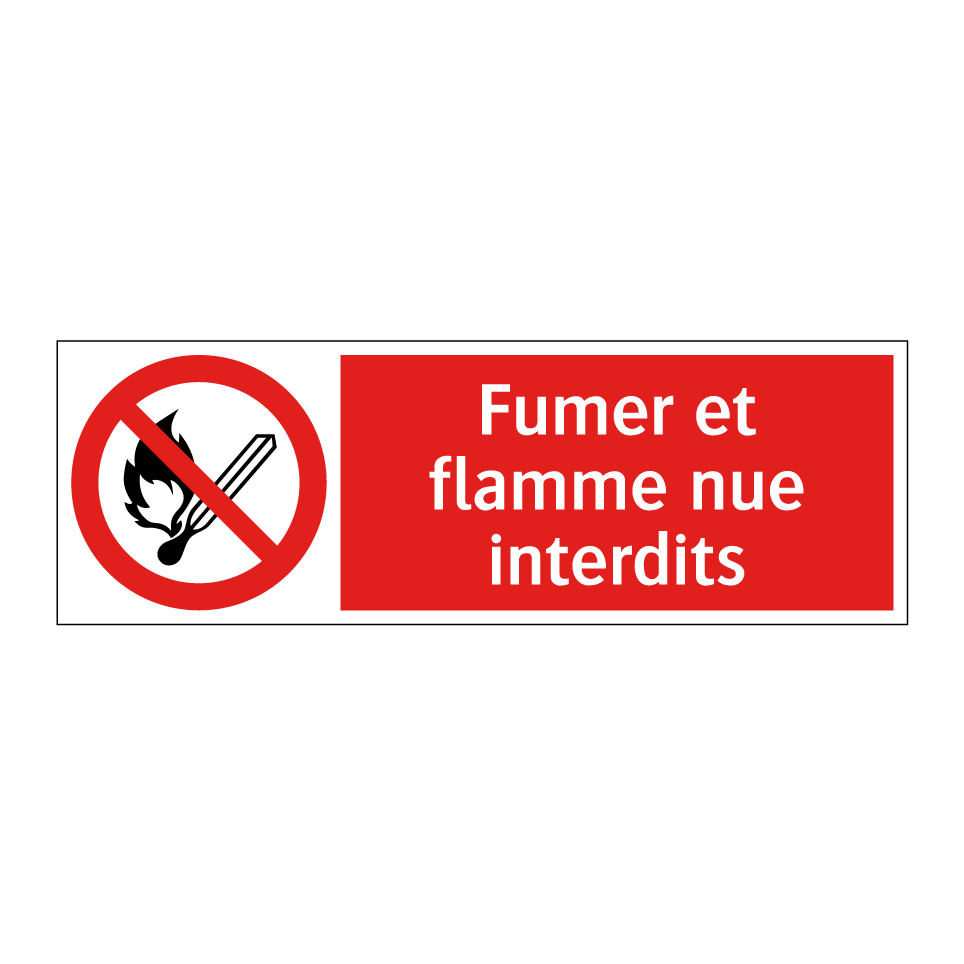 Panneau d'interdiction avec le texte : "Fumer et flamme nue interdits" et une symbolique claire.