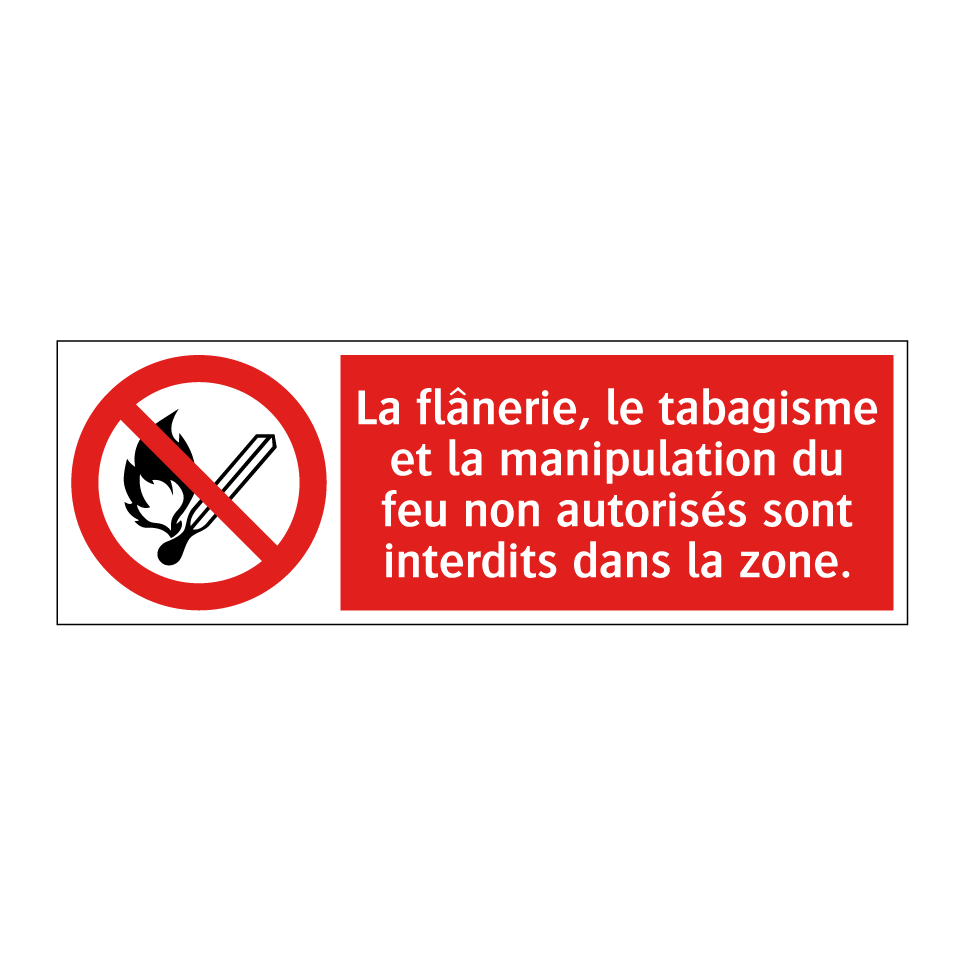 Panneau d'interdiction avec le texte : "La flânerie, le tabagisme et la manipulation du feu non autorisés sont interdits dans la zone." et une symbolique claire.