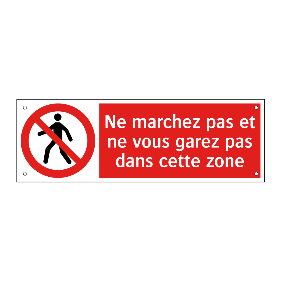 Panneau d'interdiction avec le texte : "Ne marchez pas et ne vous garez pas dans cette zone" et une symbolique claire.
