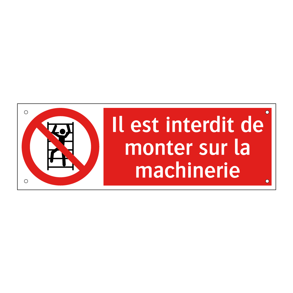 Panneau d'interdiction avec le texte : "Il est interdit de monter sur la machinerie" et une symbolique claire.