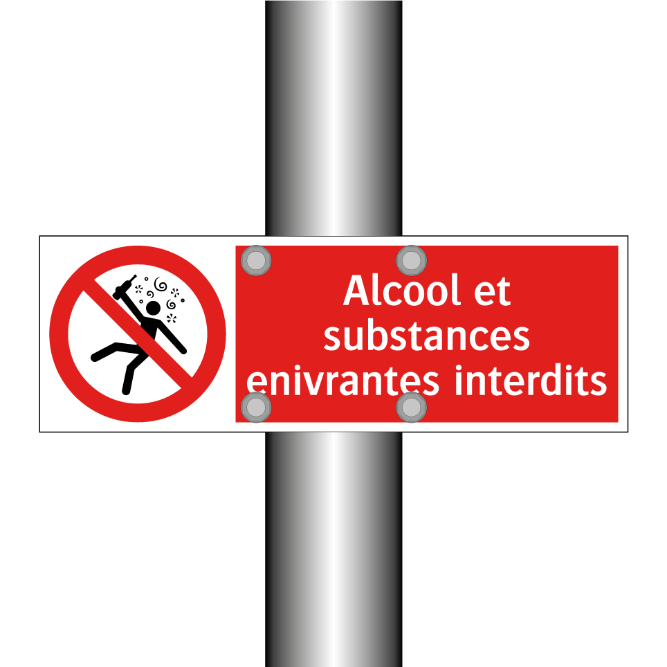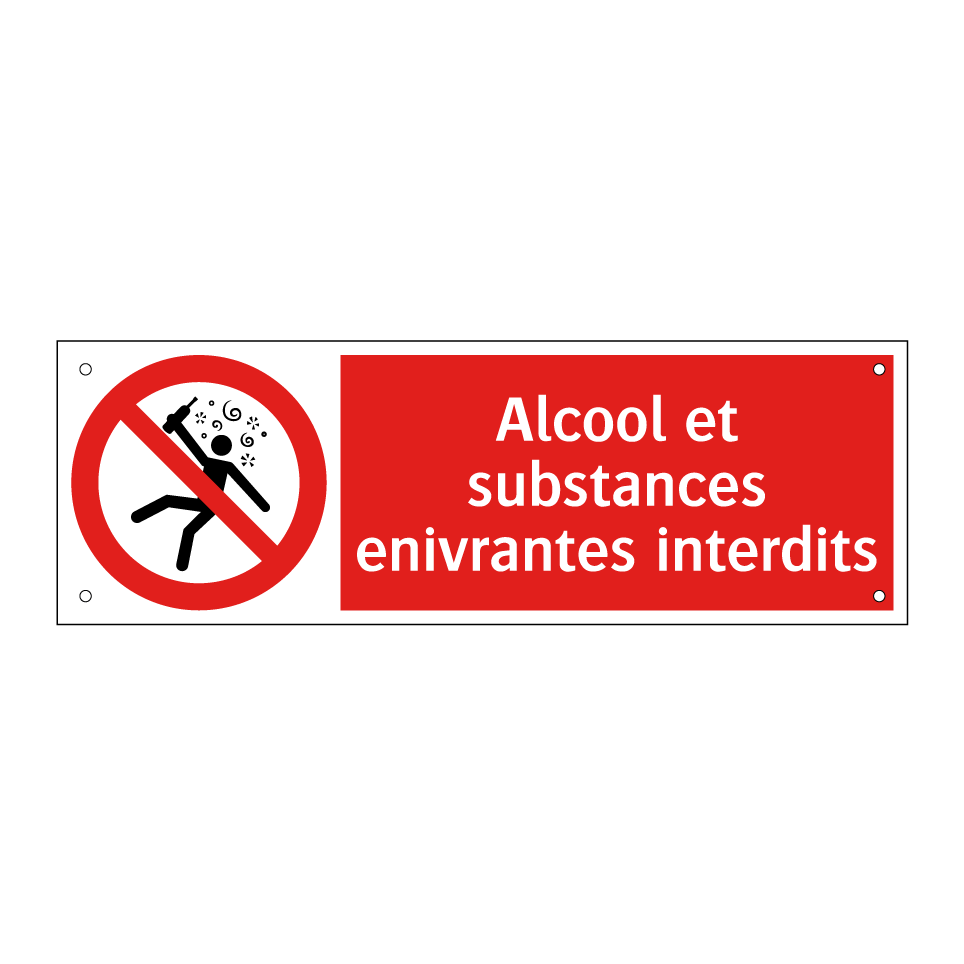 Panneau d'interdiction avec le texte : "Alcool et substances enivrantes interdits" et une symbolique claire.