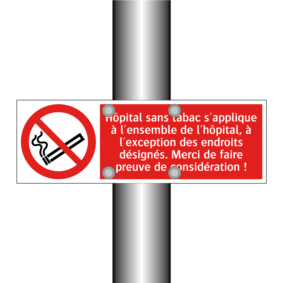 Panneau d'interdiction avec le texte : "Hôpital sans tabac s'applique à l'ensemble de l'hôpital, à l'exception des endroits désignés. Merci de faire preuve de considération !" et une symbolique claire.