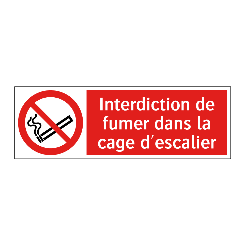 Panneau d'interdiction avec le texte : "Interdiction de fumer dans la cage d'escalier" et une symbolique claire.