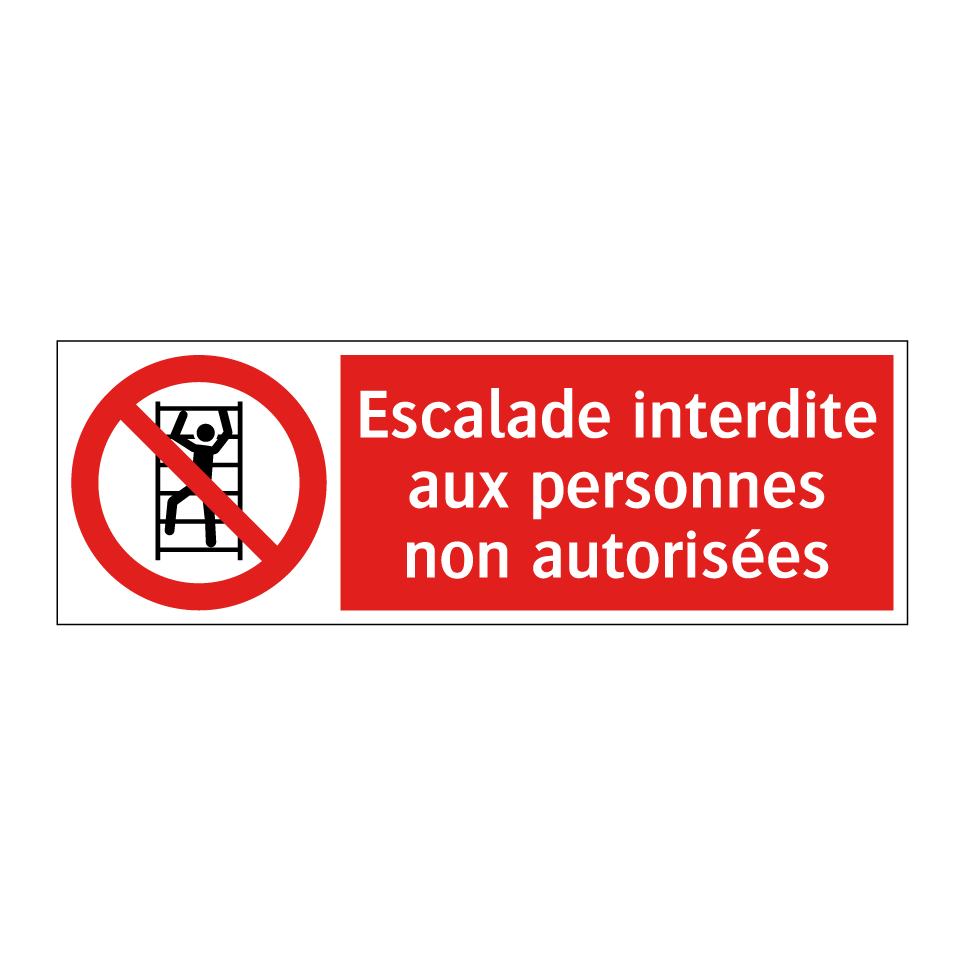 Panneau d'interdiction avec le texte : "Escalade interdite aux personnes non autorisées" et une symbolique claire.