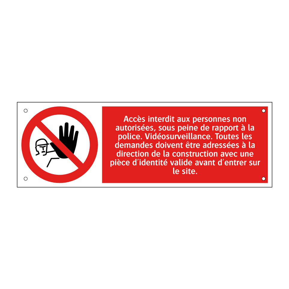Panneau d'interdiction avec le texte : "Accès interdit aux personnes non autorisées, sous peine de rapport à la police. Vidéosurveillance. Toutes les demandes doivent être adressées à la direction de la construction avec une pièce d'identité valide avant d'entrer sur le site." et une symbolique claire.