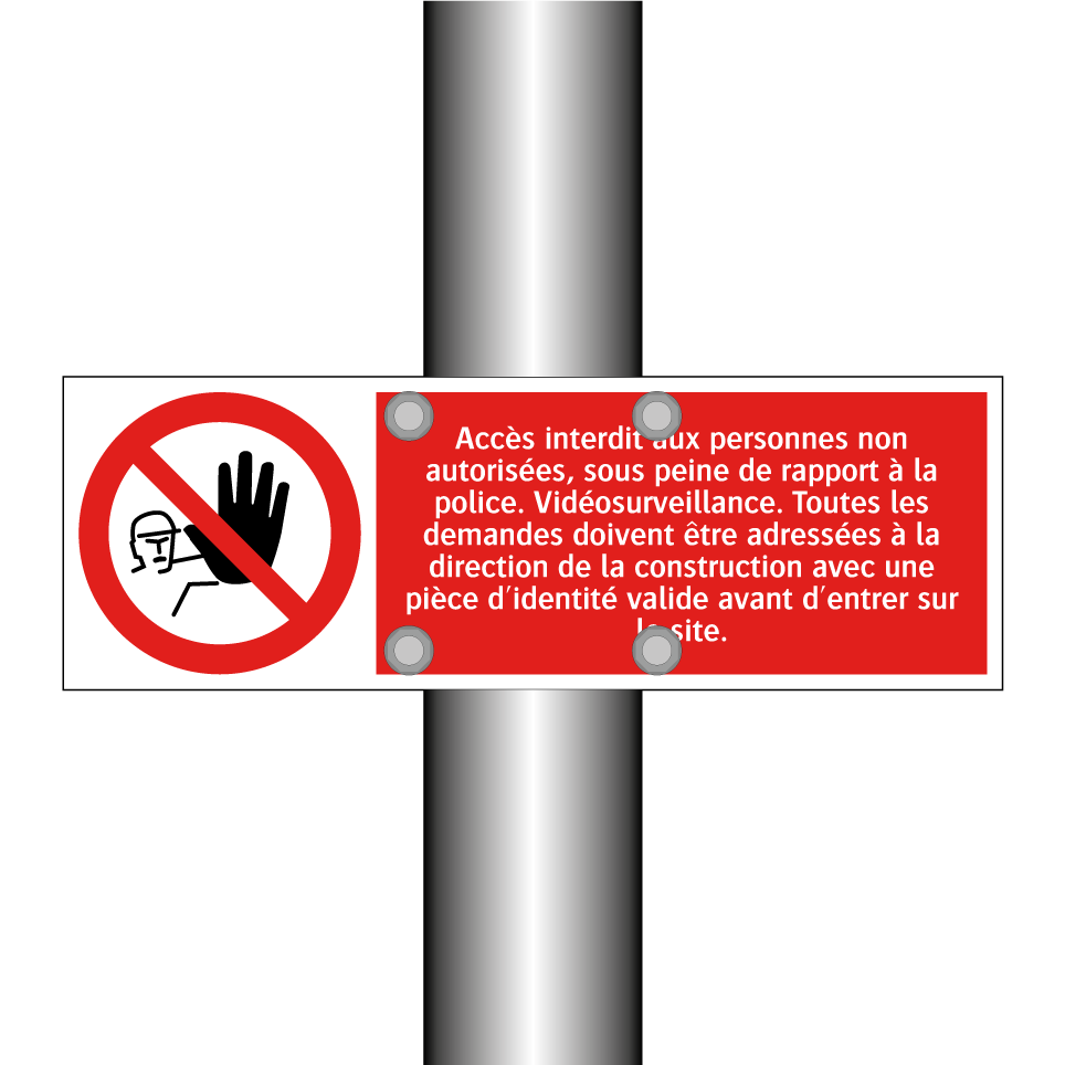 Sur les pages de catégorie ci-dessous, vous trouverez plus de produits similaires à Accès interdit aux personnes non autorisées, sous peine de rapport à la police. Vidéosurveillance. Toutes les demandes doivent être adressées à la direction de la construction avec une pièce d'identité valide avant d'entrer sur le site.. Cliquez ci-dessous pour découvrir plus de produits.
