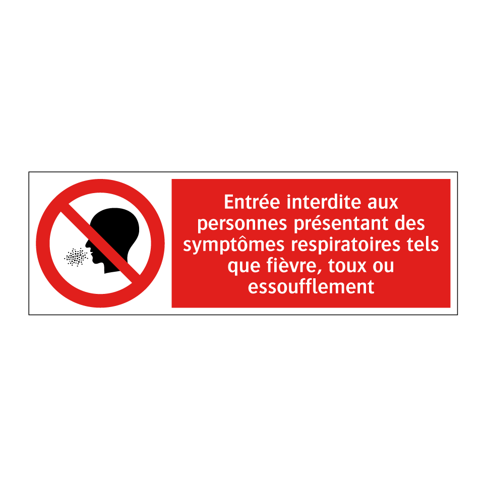 Panneau d'interdiction avec le texte : "Entrée interdite aux personnes présentant des symptômes respiratoires tels que fièvre, toux ou essoufflement" et une symbolique claire.