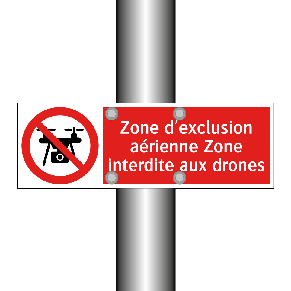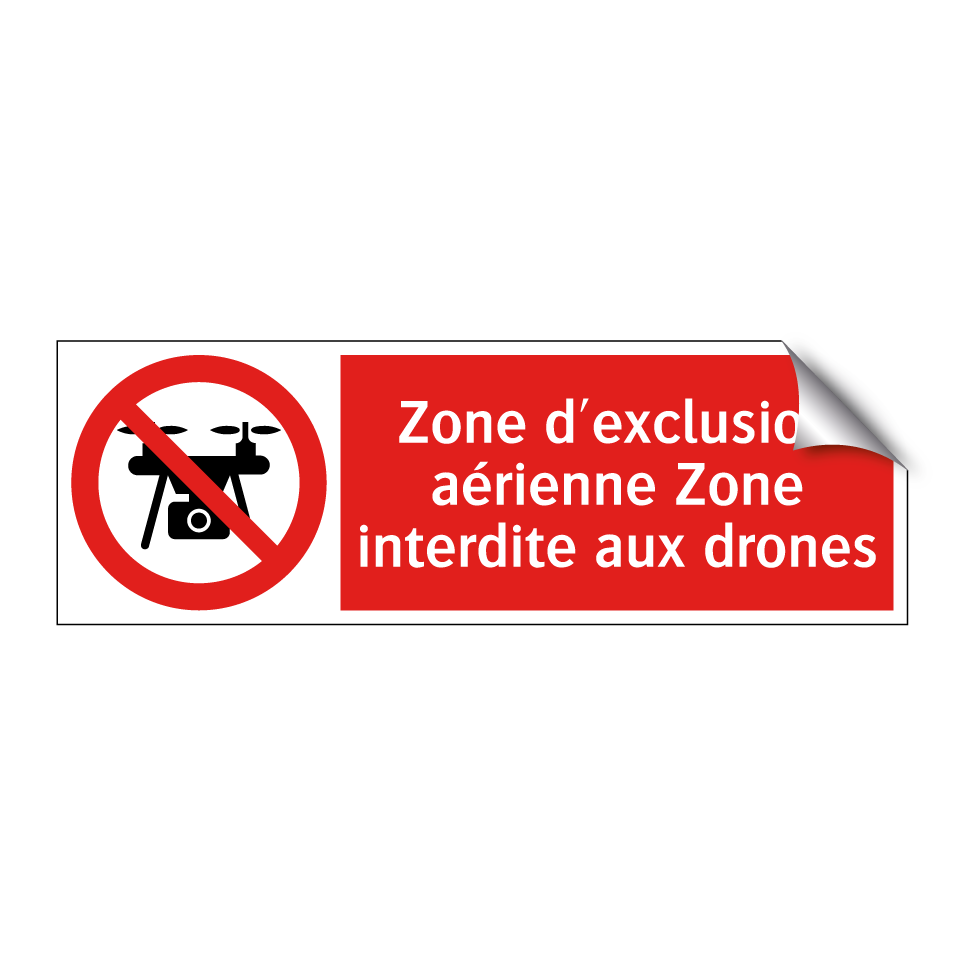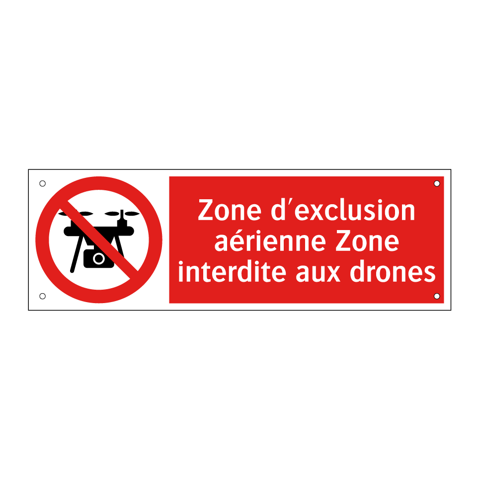 Panneau d'interdiction avec le texte : "Zone d'exclusion aérienne Zone interdite aux drones" et une symbolique claire.