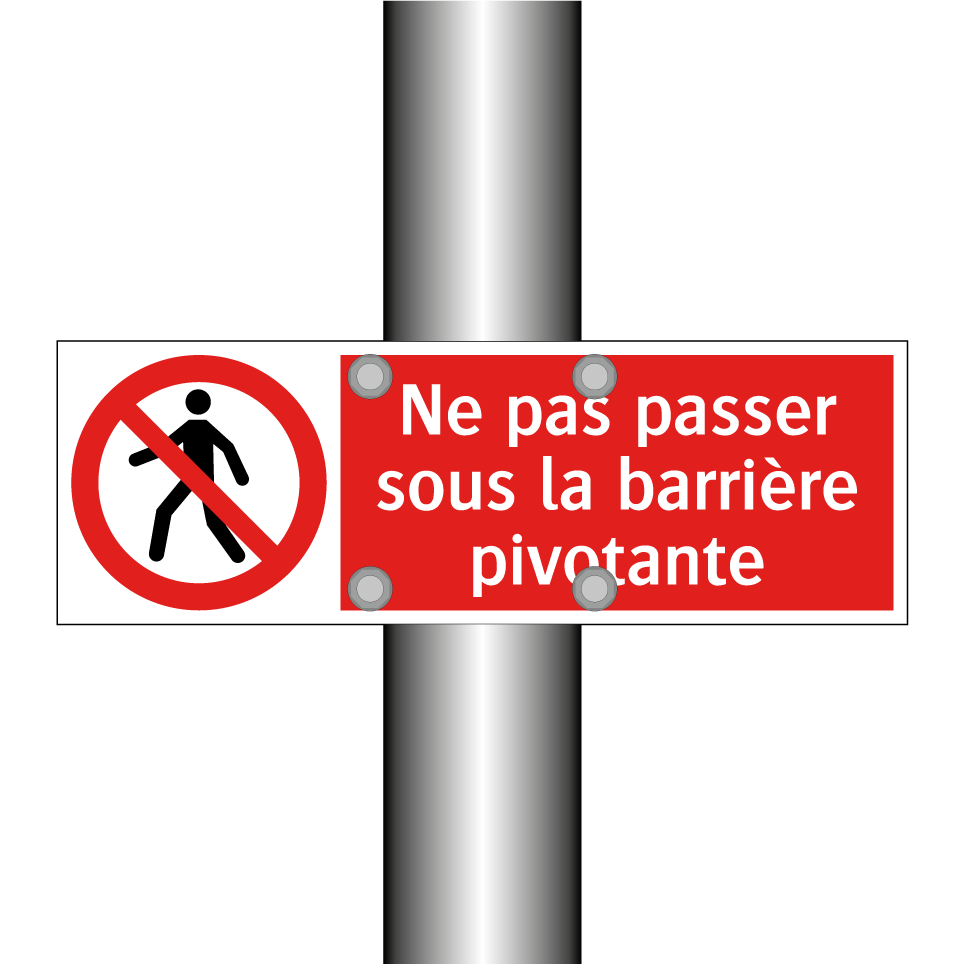 Panneau d'interdiction avec le texte : "Ne pas passer sous la barrière pivotante" et une symbolique claire.