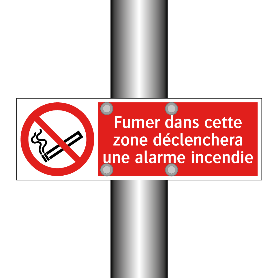 Panneau d'interdiction avec le texte : "Fumer dans cette zone déclenchera une alarme incendie" et une symbolique claire.