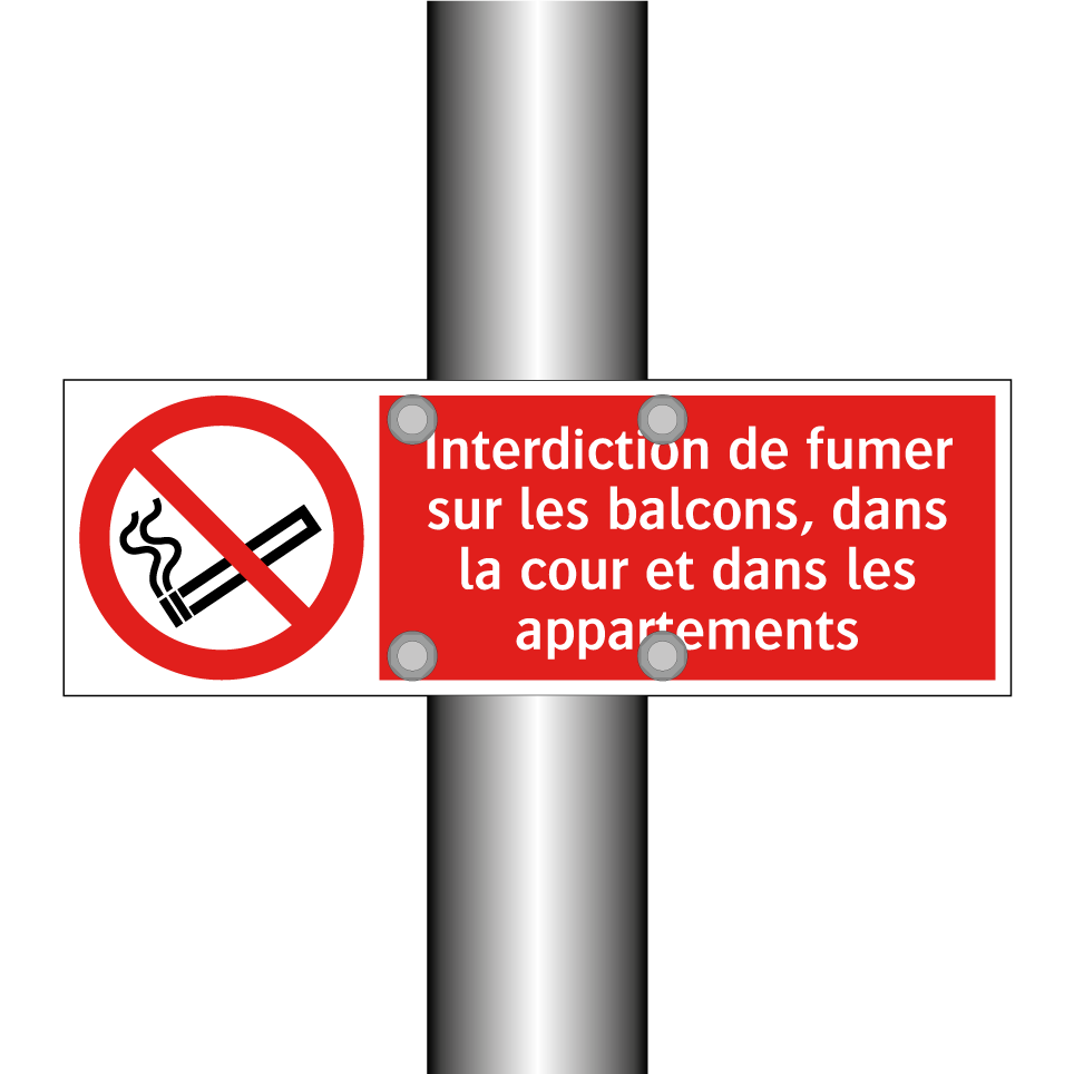 Panneau d'interdiction avec le texte : "Interdiction de fumer sur les balcons, dans la cour et dans les appartements" et une symbolique claire.