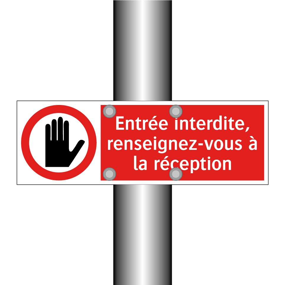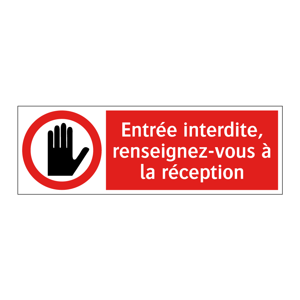 Panneau d'interdiction avec le texte : "Entrée interdite, renseignez-vous à la réception" et une symbolique claire.