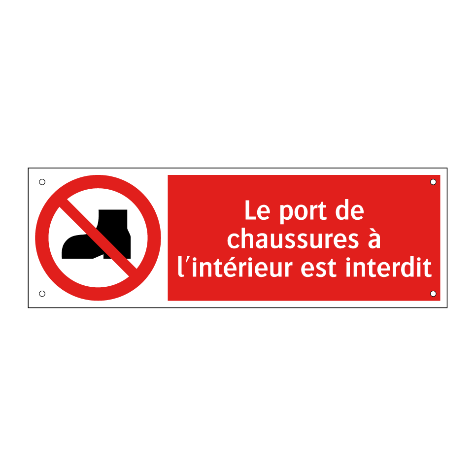 Panneau d'interdiction avec le texte : "Le port de chaussures à l'intérieur est interdit" et une symbolique claire.