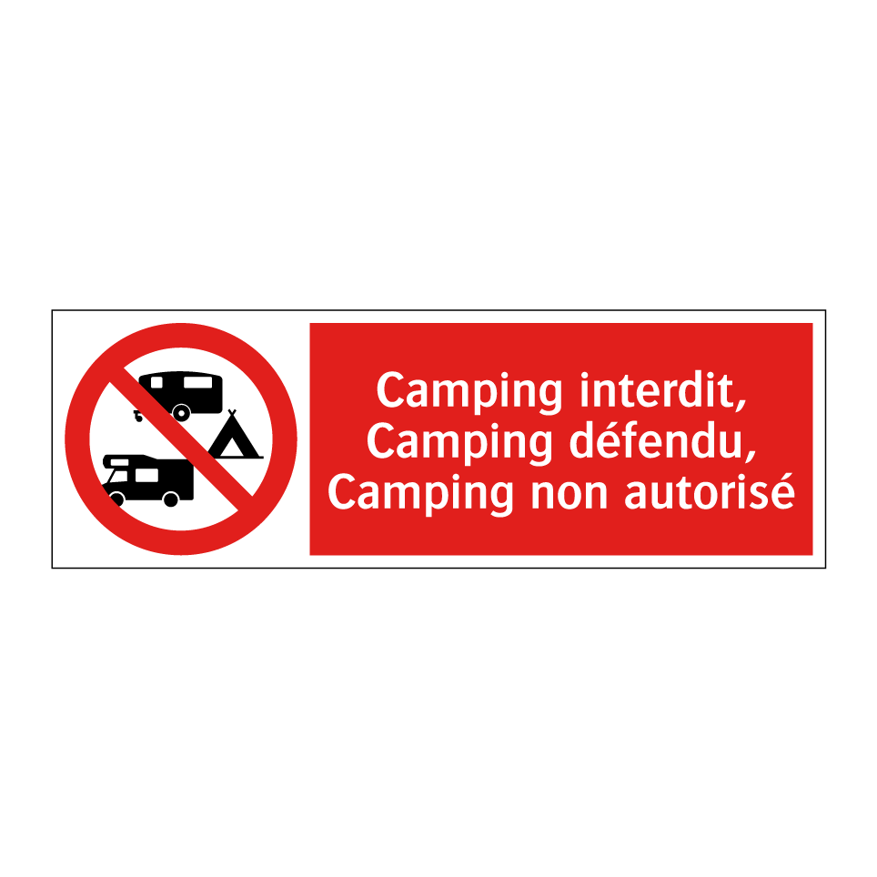 Panneau d'interdiction avec le texte : "Camping interdit, Camping défendu, Camping non autorisé" et une symbolique claire.