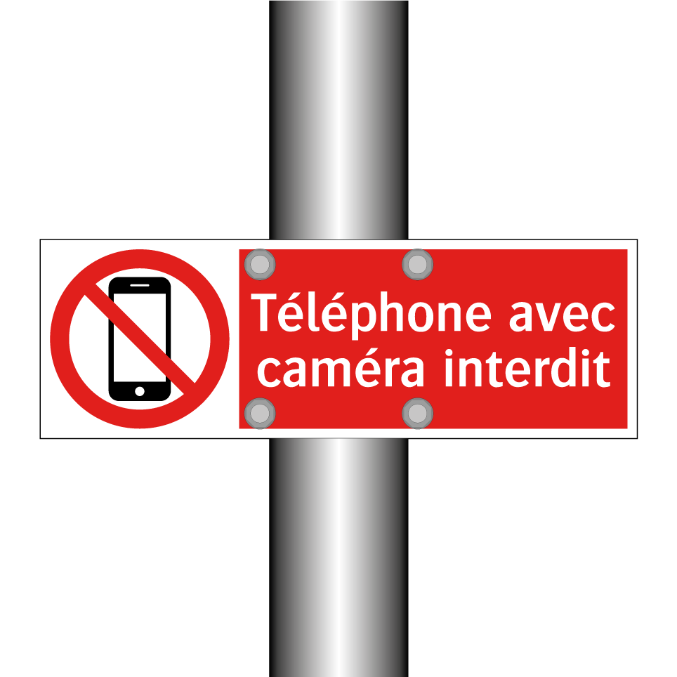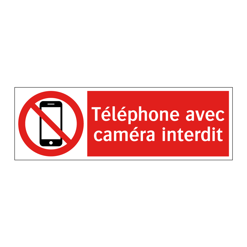 Panneau d'interdiction avec le texte : "Téléphone avec caméra interdit" et une symbolique claire.