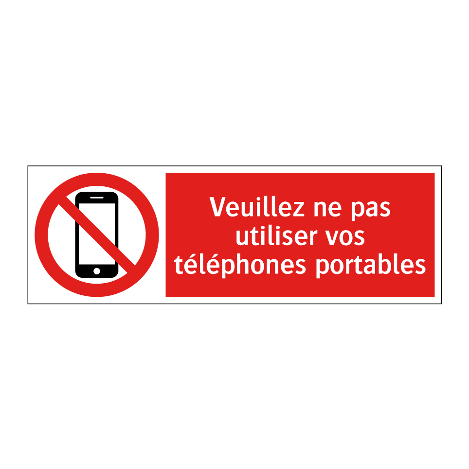 Panneau d'interdiction avec le texte : "Veuillez ne pas utiliser vos téléphones portables" et une symbolique claire.