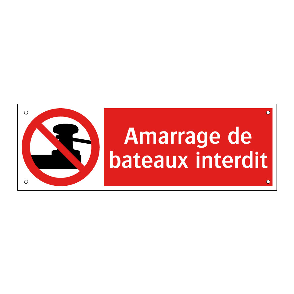 Panneau d'interdiction avec le texte : "Amarrage de bateaux interdit" et une symbolique claire.