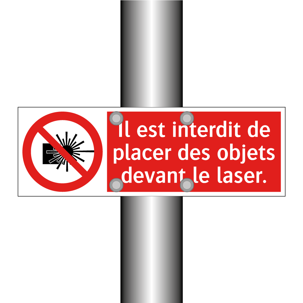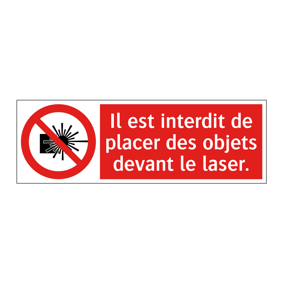 Panneau d'interdiction avec le texte : "Il est interdit de placer des objets devant le laser." et une symbolique claire.