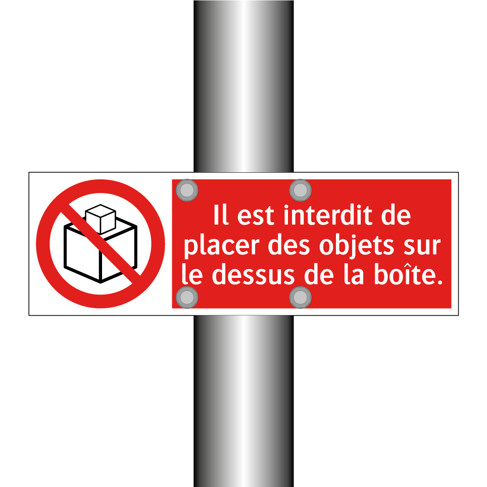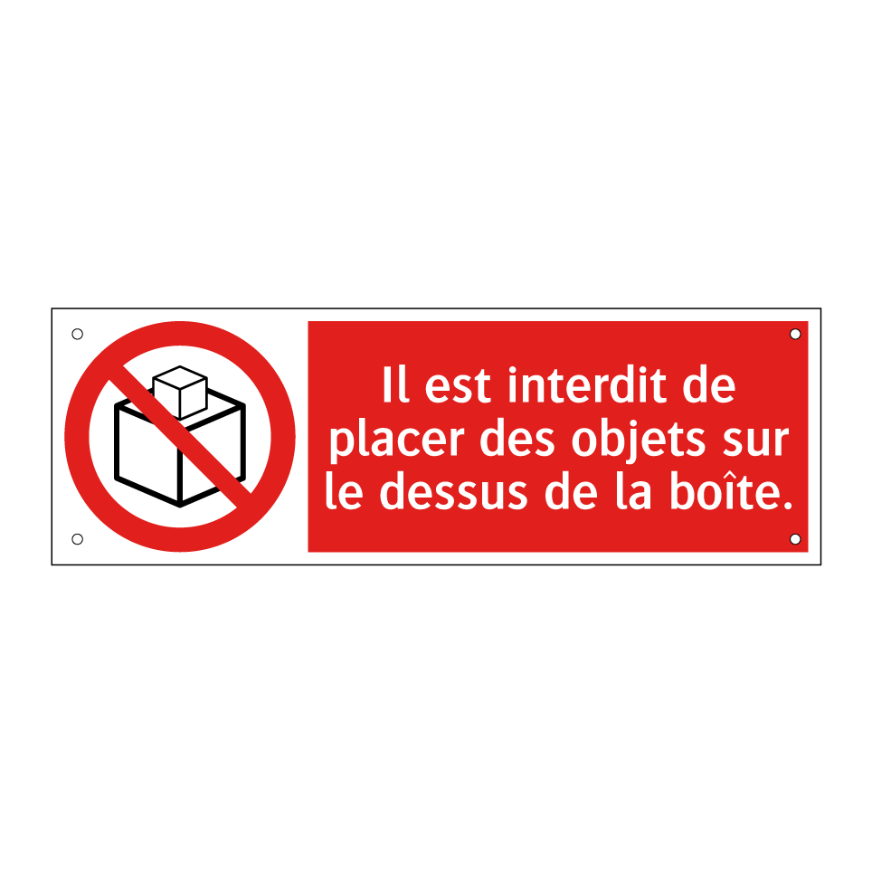 Panneau d'interdiction avec le texte : "Il est interdit de placer des objets sur le dessus de la boîte." et une symbolique claire.