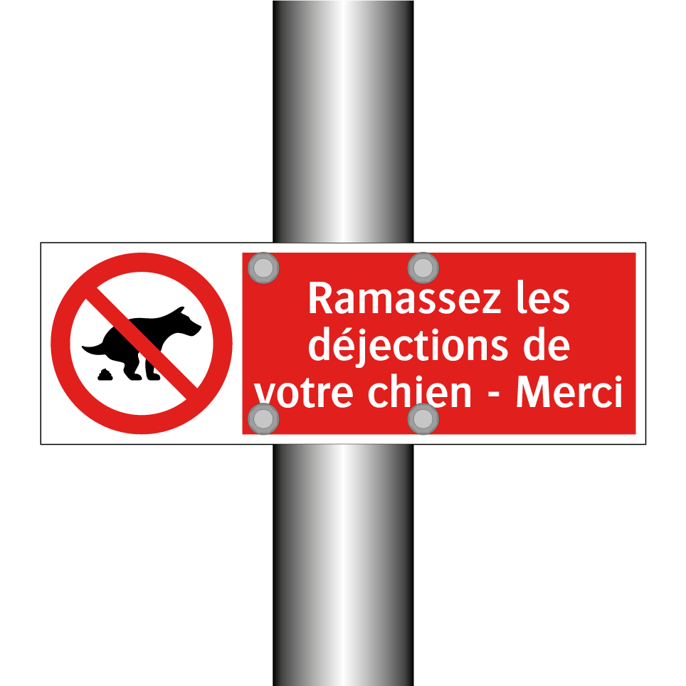 Panneau d'interdiction avec le texte : "Ramassez les déjections de votre chien - Merci" et une symbolique claire.