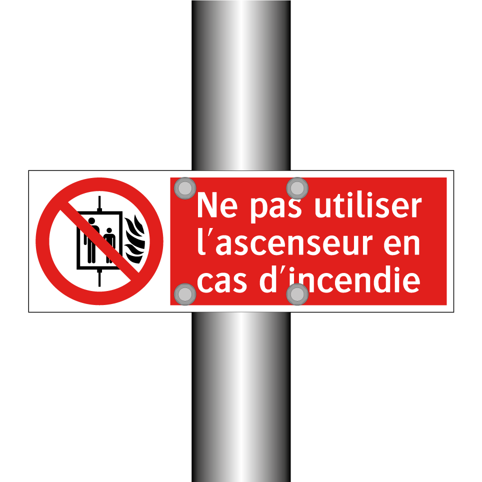 Panneau d'interdiction avec le texte : "Ne pas utiliser l'ascenseur en cas d'incendie" et une symbolique claire.
