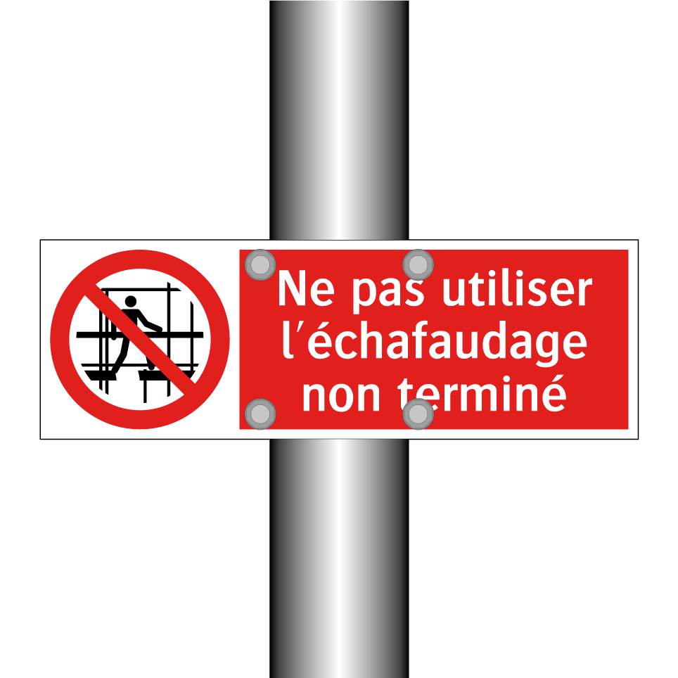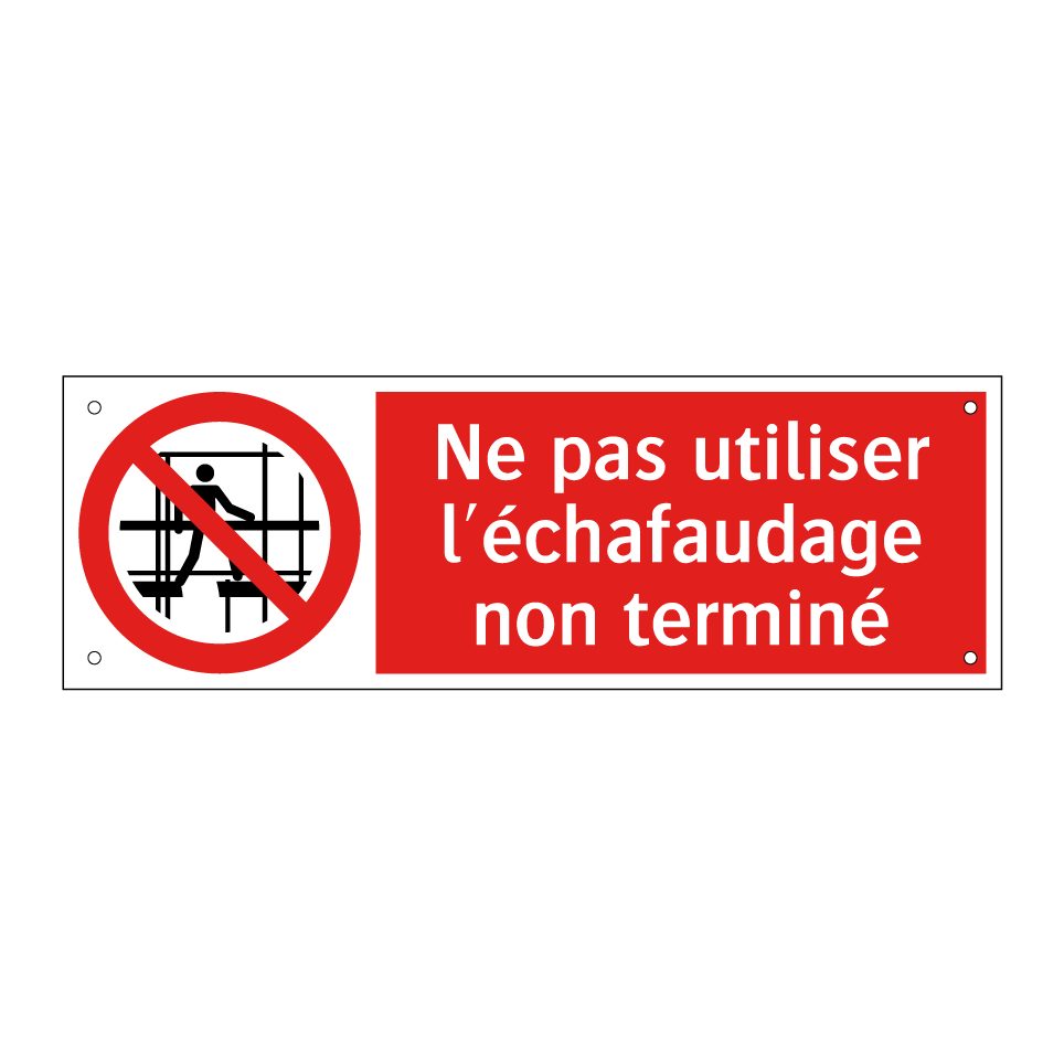 Panneau d'interdiction avec le texte : "Ne pas utiliser l'échafaudage non terminé" et une symbolique claire.