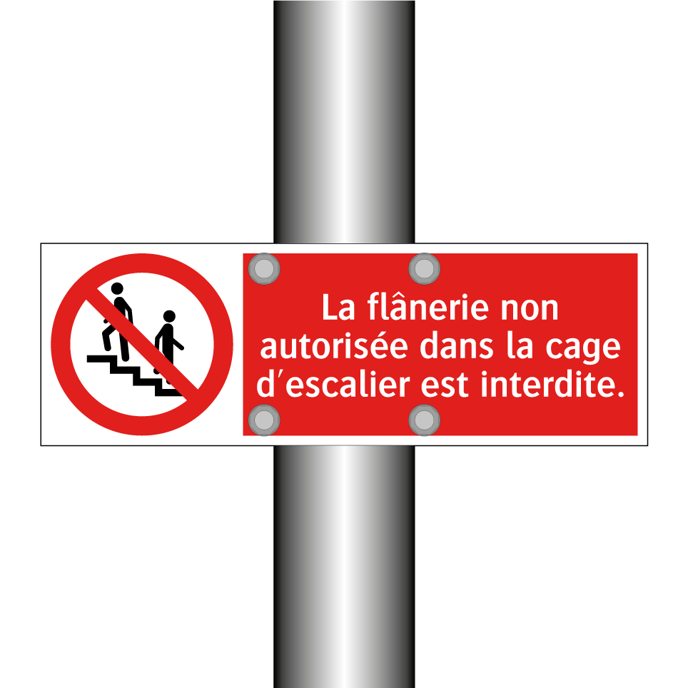 Panneau d'interdiction avec le texte : "La flânerie non autorisée dans la cage d'escalier est interdite." et une symbolique claire.