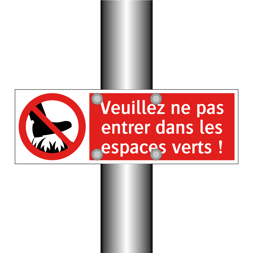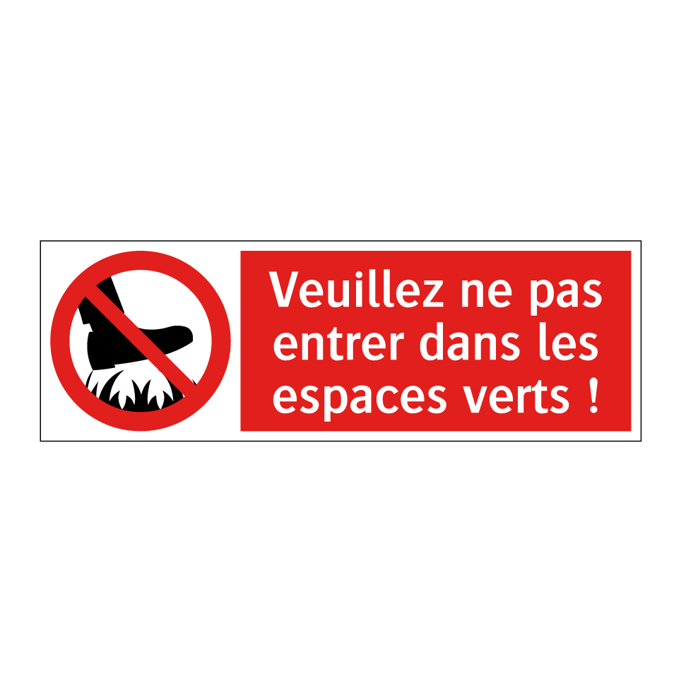Panneau d'interdiction avec le texte : "Veuillez ne pas entrer dans les espaces verts !" et une symbolique claire.