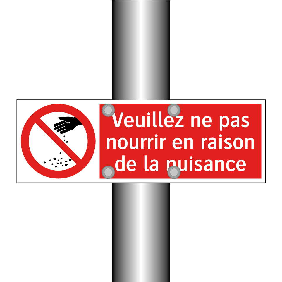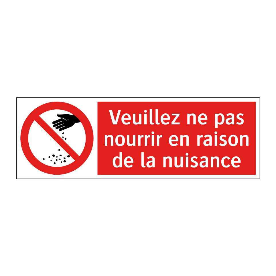 Panneau d'interdiction avec le texte : "Veuillez ne pas nourrir en raison de la nuisance" et une symbolique claire.
