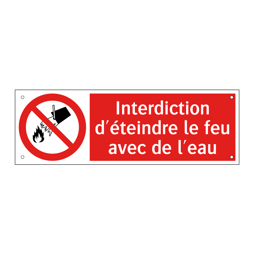 Panneau d'interdiction avec le texte : "Interdiction d'éteindre le feu avec de l'eau" et une symbolique claire.