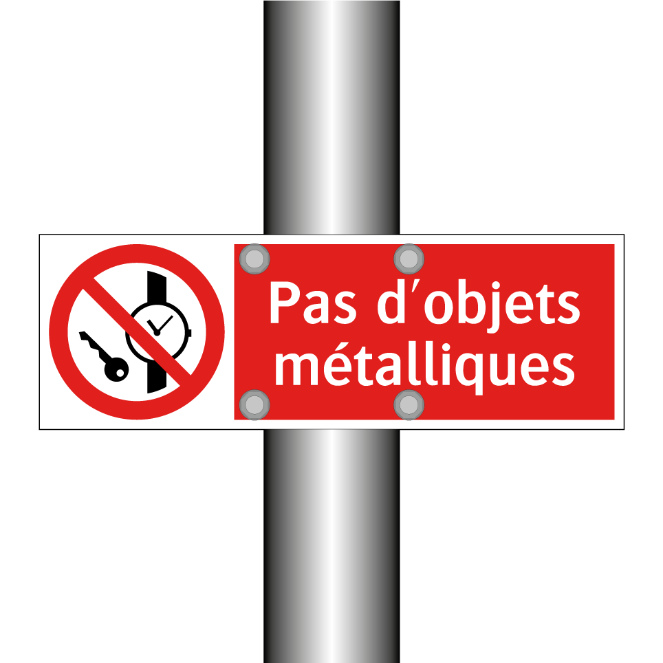 Panneau d'interdiction avec le texte : "Pas d'objets métalliques" et une symbolique claire.