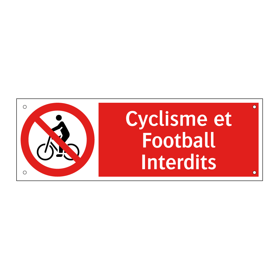 Panneau d'interdiction avec le texte : "Cyclisme et Football Interdits" et une symbolique claire.