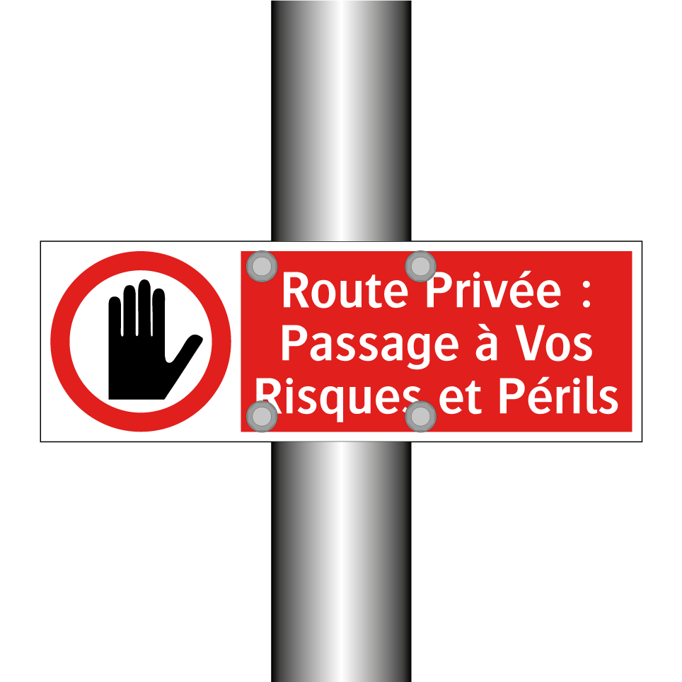 Panneau d'interdiction avec le texte : "Route Privée : Passage à Vos Risques et Périls" et une symbolique claire.