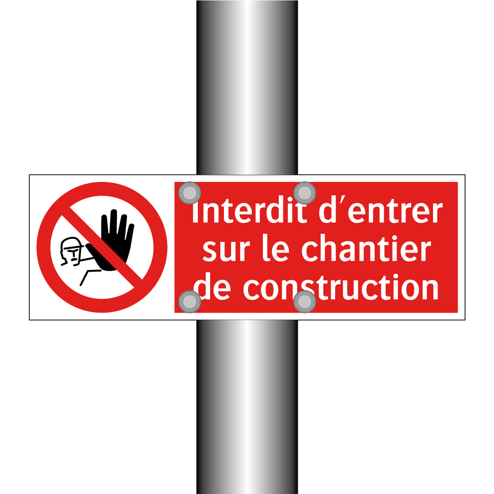 Panneau d'interdiction avec le texte : "Interdit d'entrer sur le chantier de construction" et une symbolique claire.