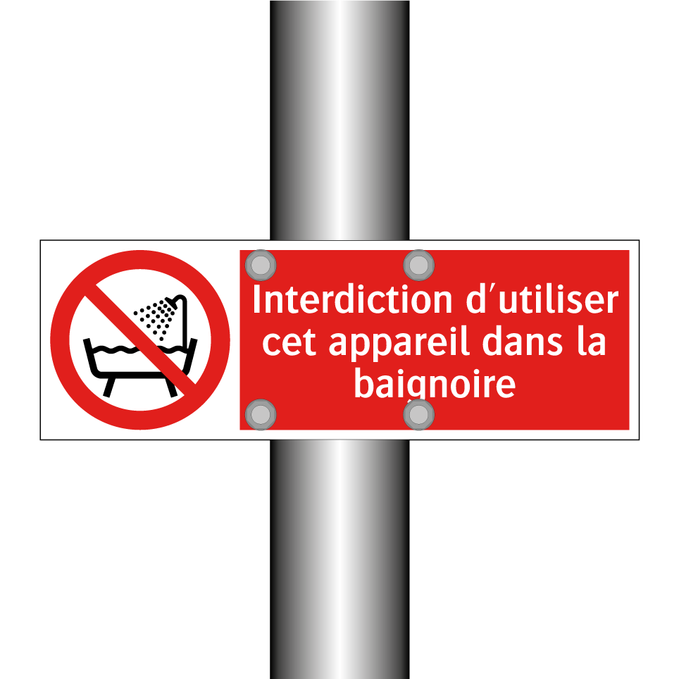 Panneau d'interdiction avec le texte : "Interdiction d'utiliser cet appareil dans la baignoire" et une symbolique claire.