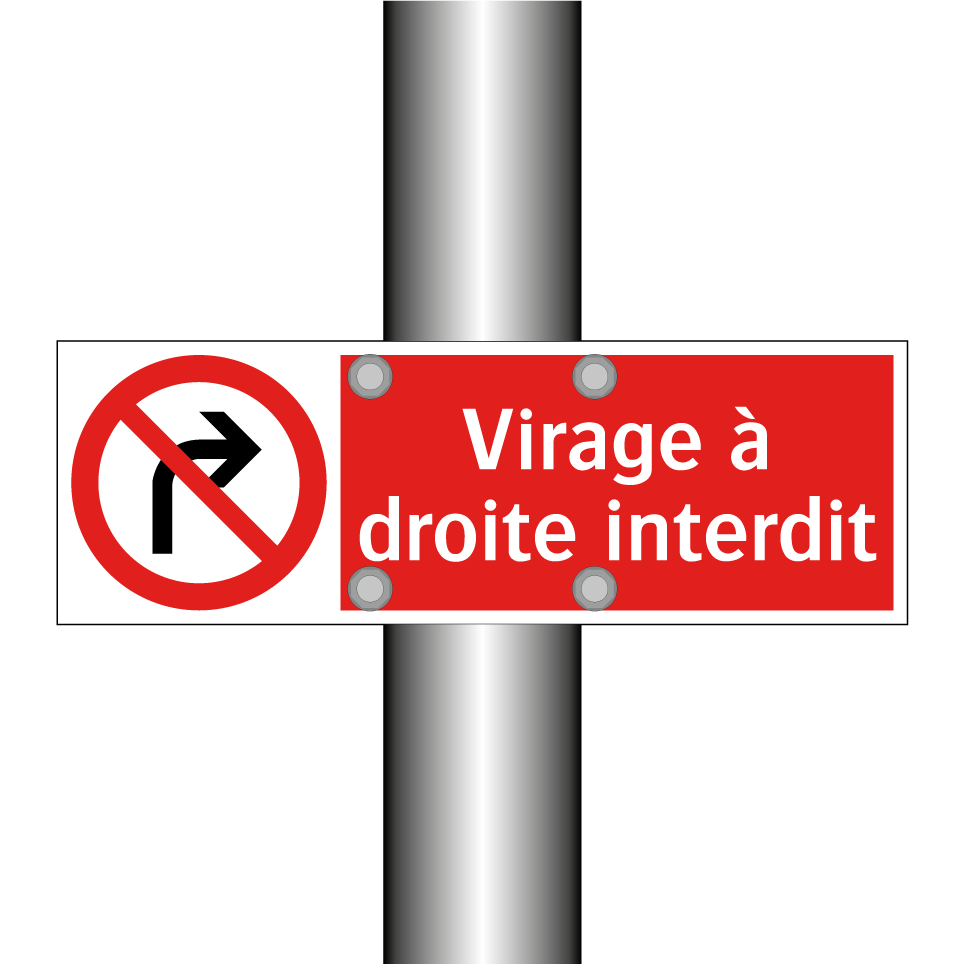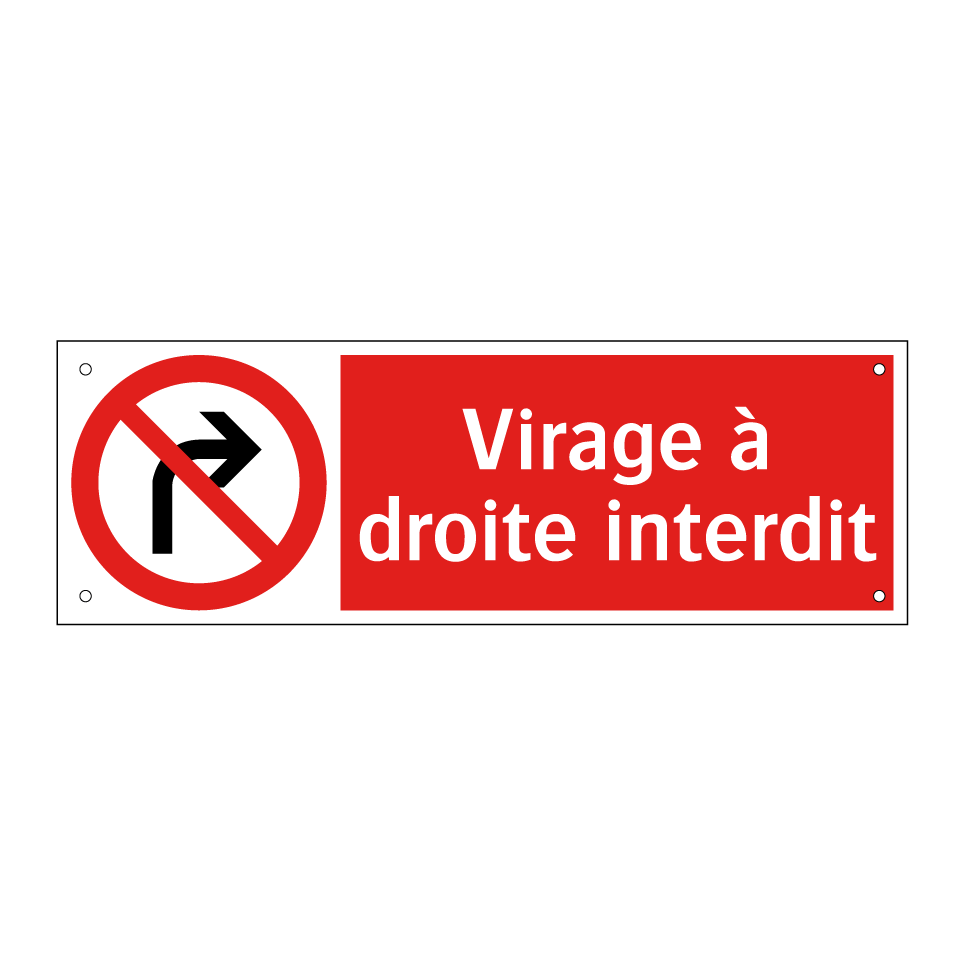 Panneau d'interdiction avec le texte : "Virage à droite interdit" et une symbolique claire.