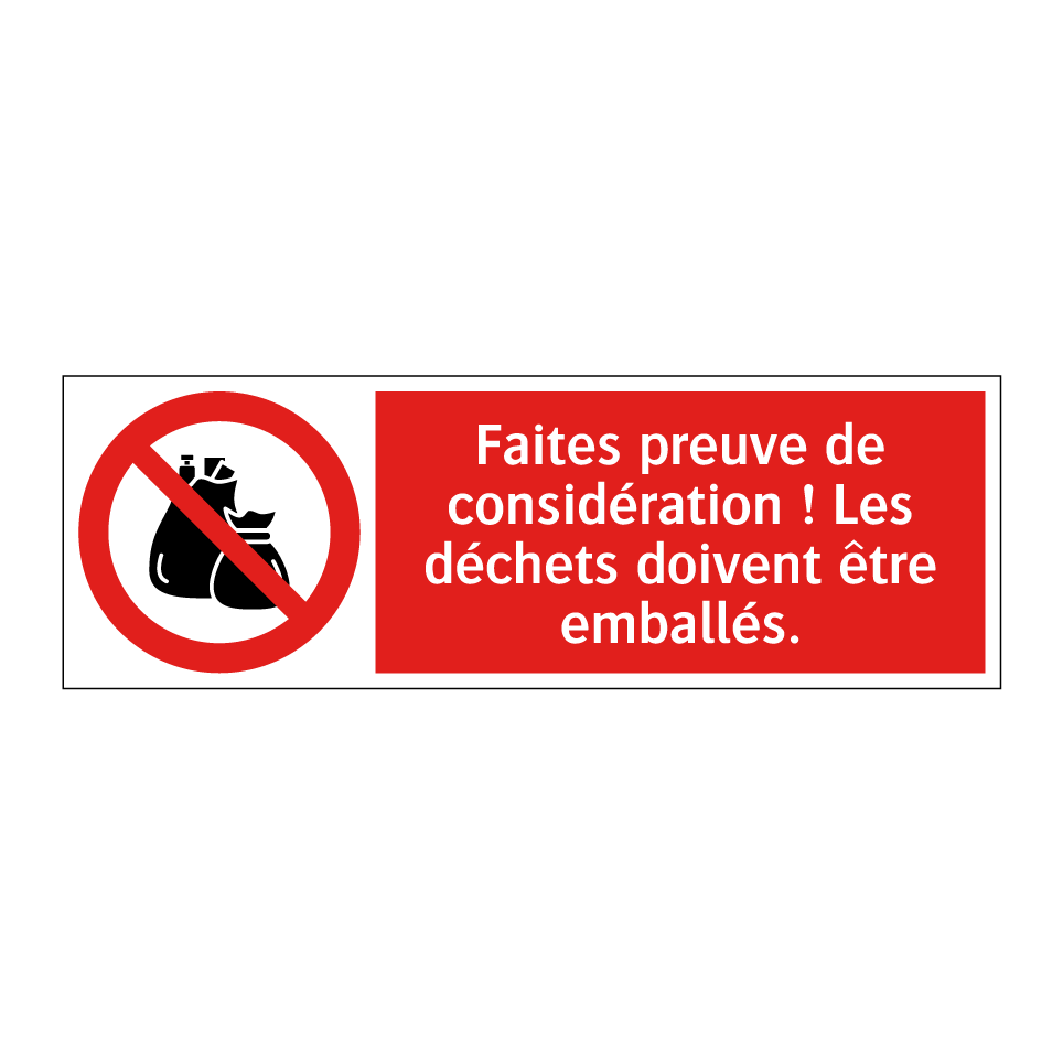Panneau d'interdiction avec le texte : "Faites preuve de considération ! Les déchets doivent être emballés." et une symbolique claire.
