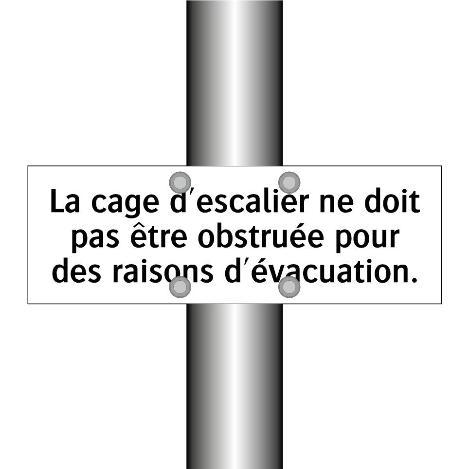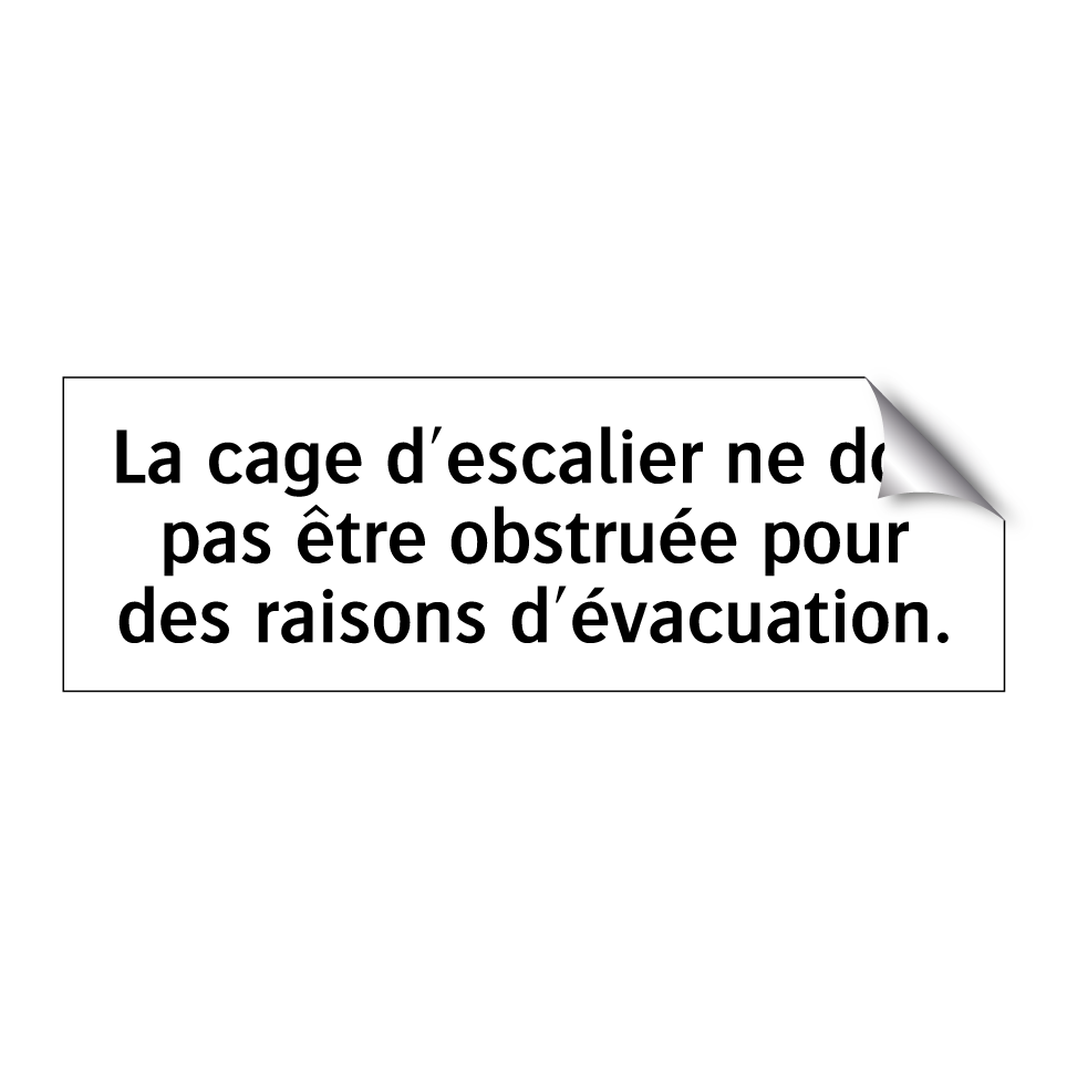 Panneau d'interdiction avec le texte : "La cage d'escalier ne doit pas être obstruée pour des raisons d'évacuation."