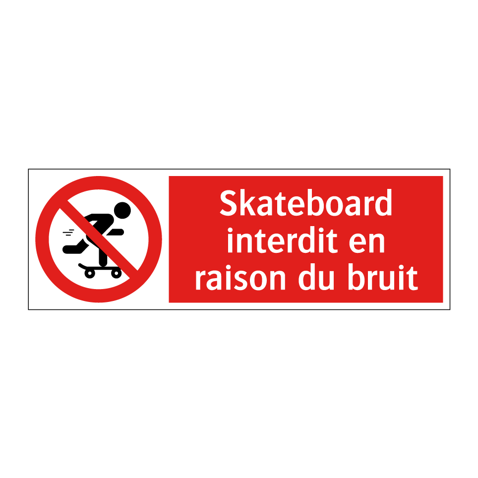 Panneau d'interdiction avec le texte : "Skateboard interdit en raison du bruit" et une symbolique claire.