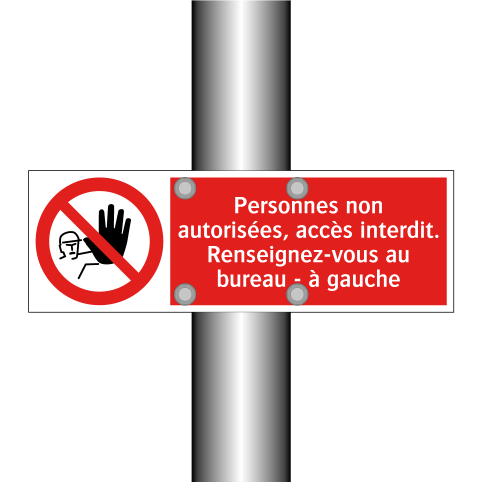 Panneau d'interdiction avec le texte : "Personnes non autorisées, accès interdit. Renseignez-vous au bureau - à gauche" et une symbolique claire.