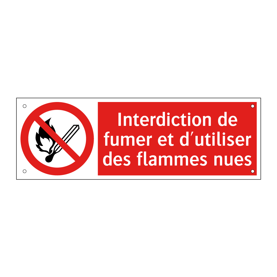 Panneau d'interdiction avec le texte : "Interdiction de fumer et d'utiliser des flammes nues" et une symbolique claire.