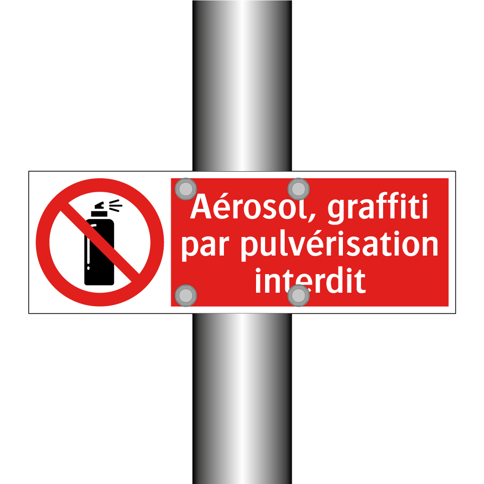 Panneau d'interdiction avec le texte : "Aérosol, graffiti par pulvérisation interdit" et une symbolique claire.