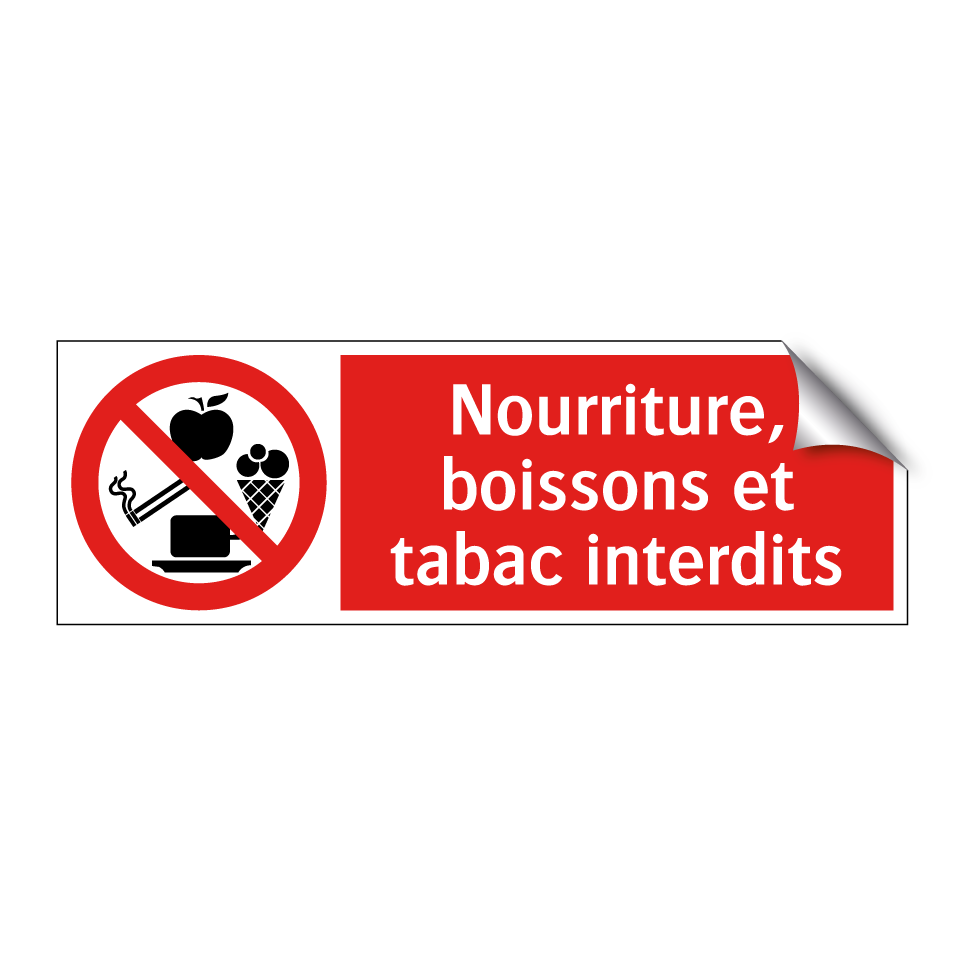 Panneau d'interdiction avec le texte : "Nourriture, boissons et tabac interdits" et une symbolique claire.