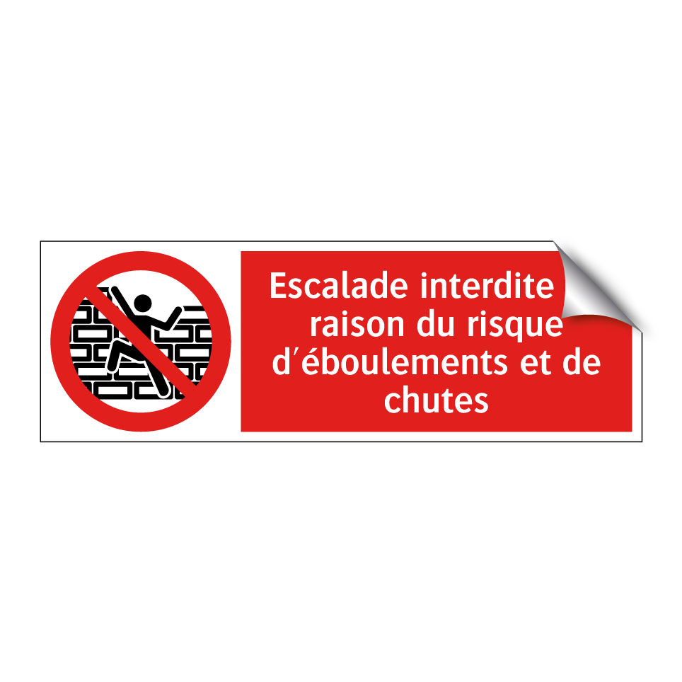 Panneau d'interdiction avec le texte : "Escalade interdite en raison du risque d'éboulements et de chutes" et une symbolique claire.