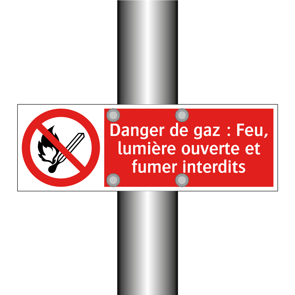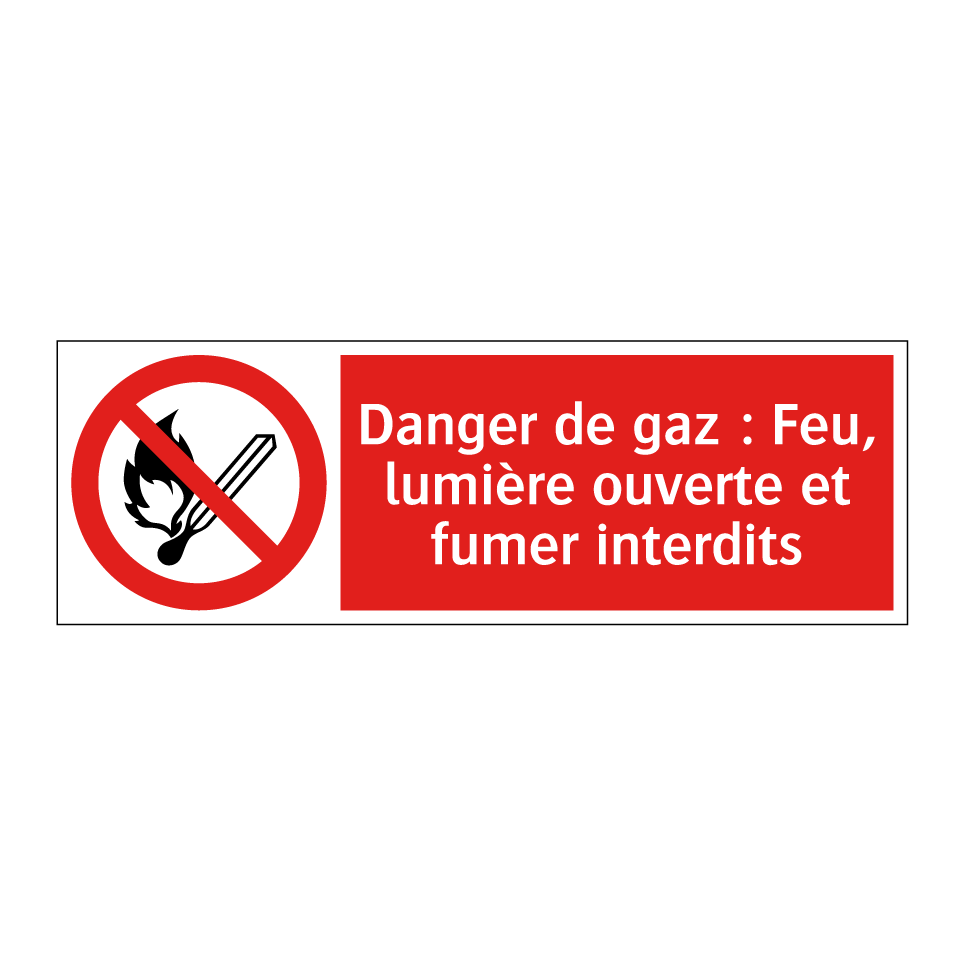 Panneau d'interdiction avec le texte : "Danger de gaz : Feu, lumière ouverte et fumer interdits" et une symbolique claire.